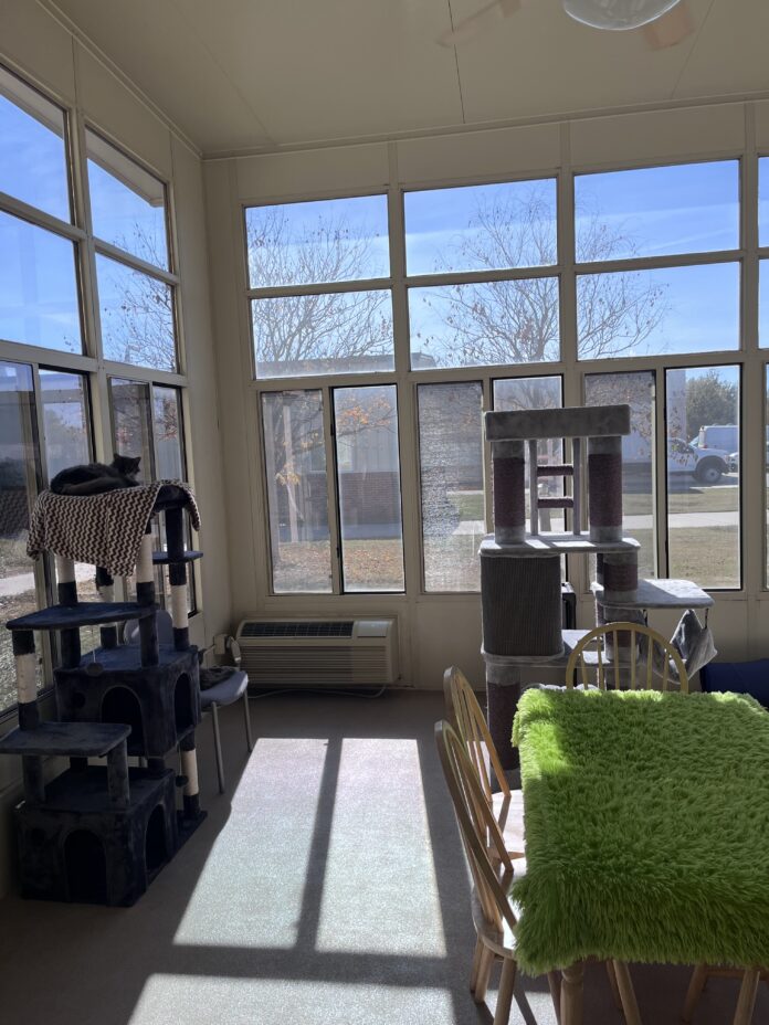 The boarding cats have just one kennel room since fewer cats board at the facility. Attached to the kennel room for cats is a sunroom where the endowment cats like to spend their time. Three walls of the room are mostly made of windows, allowing the sun to shine in the room at most hours of the day.