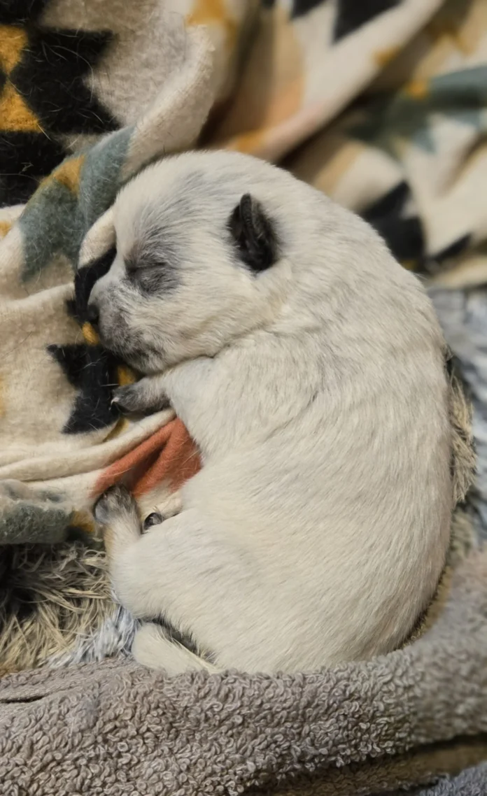 I look over into the adjacent puppy pen where Bolt and Penny are deep in midmorning slumber. Bolt is on his back with his front paws twitching slightly in dream-induced play, while Penny is curled into a little donut on the plush bed inside their crate. This is the calm before the full-litter storm.