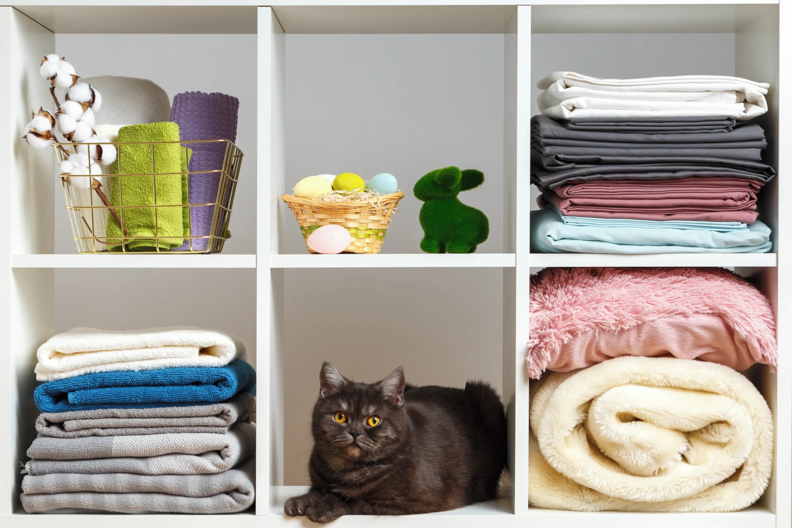 Before organizing and categorizing, Mason advises taking inventory and removing anything that’s expired, broken, worn out or no longer needed. This is also a great time to donate gently used items to rescue shelters if they’re no longer in rotation, such as well-loved blankets or hand towels.